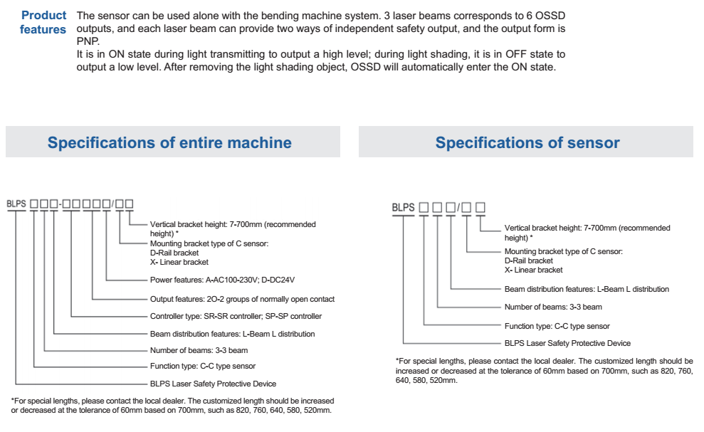 Sensors can be used alone with the control system of the press brake. Three detecting beams provide six channels of OSSD outputs, and each detecting beam provides two independent safety outputs in the form of PNP.