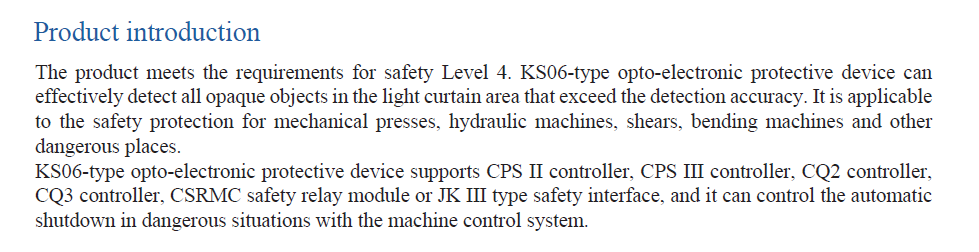KS06 AOPD can effectively detect all opaque objects in the light curtain area that exceed the detection accuracy. It is applicable to the safety protection for mechanical presses, hydraulic machines, shears, bending machines and other dangerous places. Site application