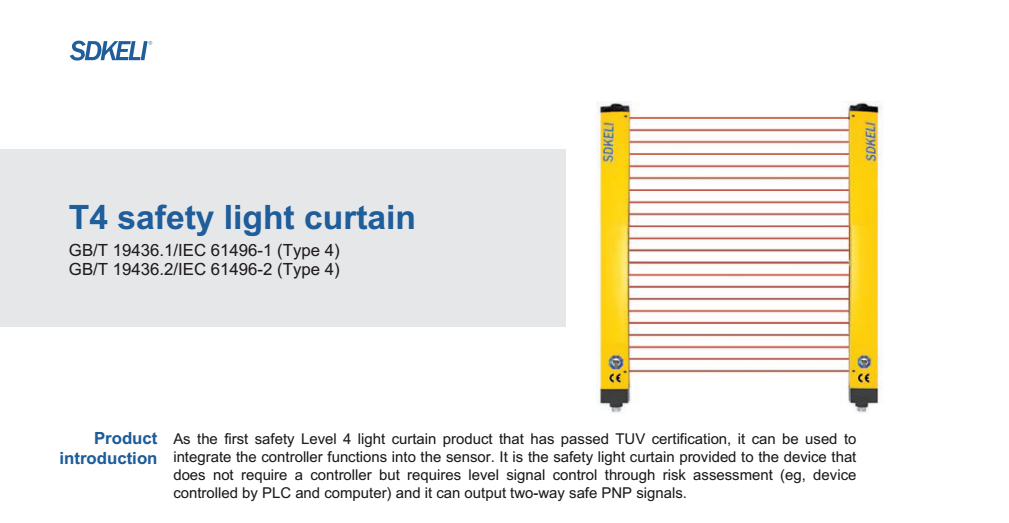 SDKELI T4 series Safety Light Curtain is the first safety light curtain that has passed TUV certification. It can be used to integrate the controller functionsinto the sensor. It is the safety light curtain provided to the device that does not require a controller but requires level signal control through risk assessment. It can output two-way safe PNP signals.